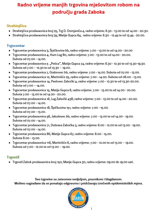 Stožer civilne zaštite Grada Zaboka objavio je kakvo je radno vrijeme manjih trgovina mješovitom robom na području grada Zaboka.
